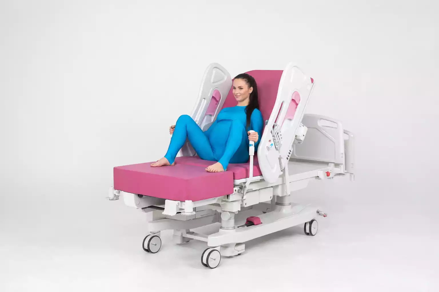 Gracias a su estructura estable de columnas, la cama ofrece un entorno seguro incluso en posiciones de parto más exigentes, y su diseño ajustable permite adaptar la configuración en segundos mediante sistemas de mando independientes (panel central, mando alámbrico, controles integrados).